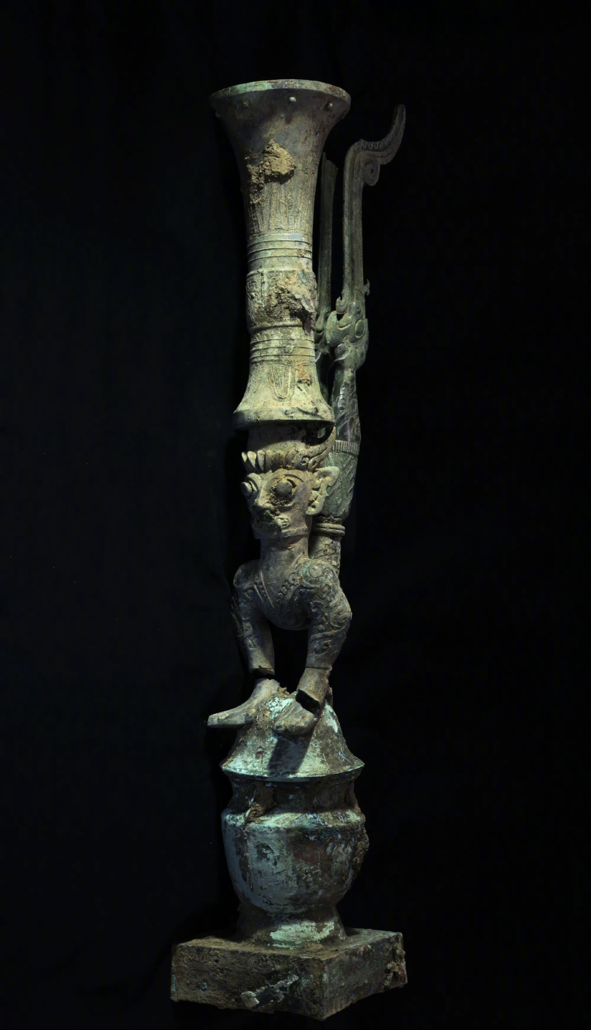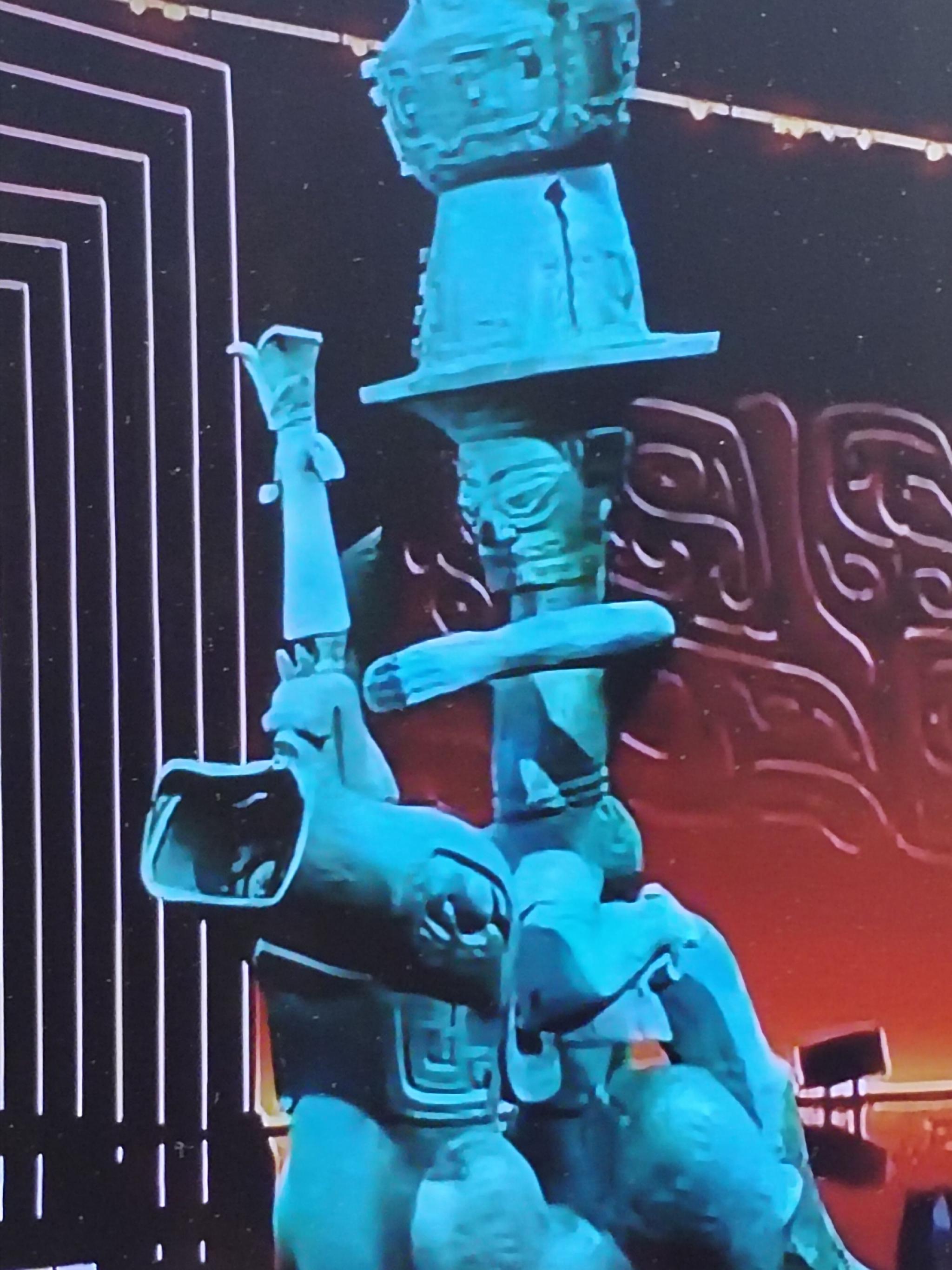 值得注意的是,这个巨大的神兽在出土之时,头顶就已经站立了一个青铜立人,似是负责祭祀的巫师形象,如今相当于发现这个超级壮实的神兽不仅头顶站了人,背上还驼了人,背上驮着的人头顶还顶有盛着祭祀贡品的青铜尊。层层叠叠,前仆后继。