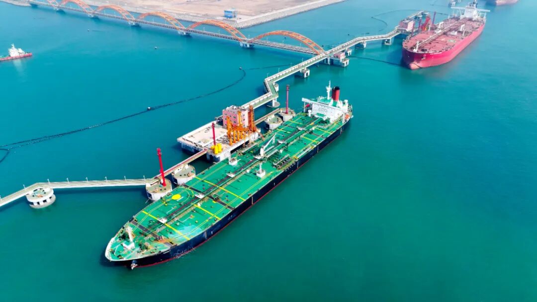 在山东港口日照港岚山港区30万吨级油品码头,船舶停靠进行卸油作业图源:新华社