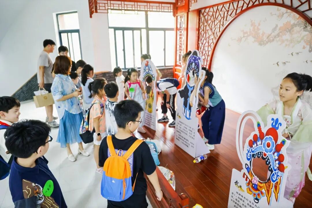 现场,在萧山绍剧团专业老师的带领下,孩子们接触绍剧文化,参观了解绍剧的练功、排练、演出道具、服装和器材等资料。
