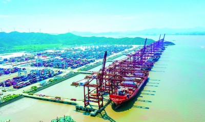 宁波舟山港金塘港区大浦口集装箱码头货运繁忙。舟山市新闻传媒中心张磊拍摄