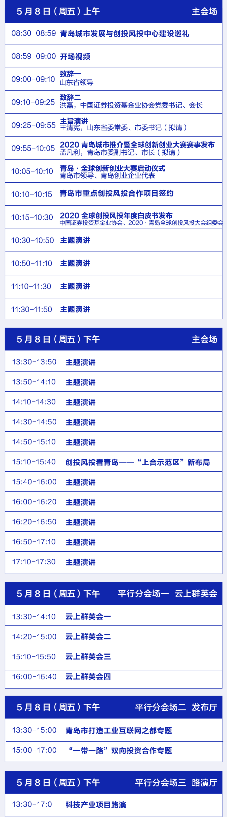 2020年5月8日至9日,青岛•全球创投风投大会如期而来。由于特殊的时点与全球环境,让这场大会较去年的风云际会,承载起更多的社会责任与经济意义,并用特殊的方式更加别开生面。