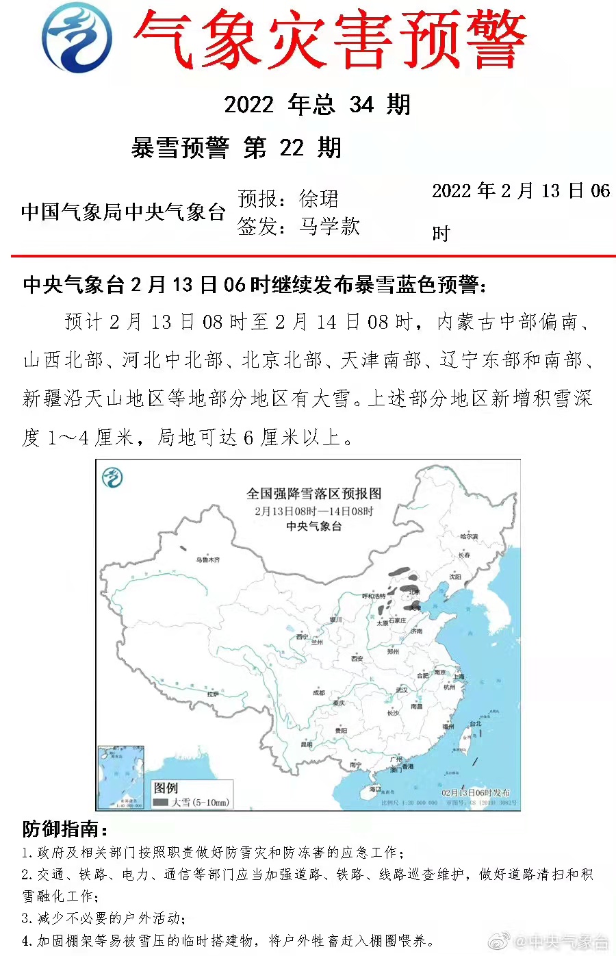 中央气象台2月13日06时继续发布暴雪蓝色预警: