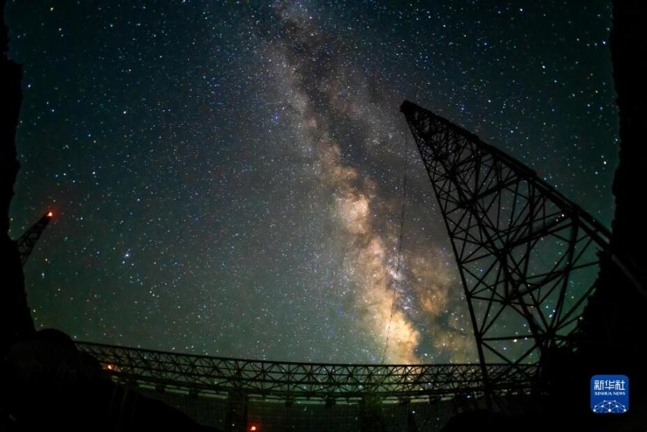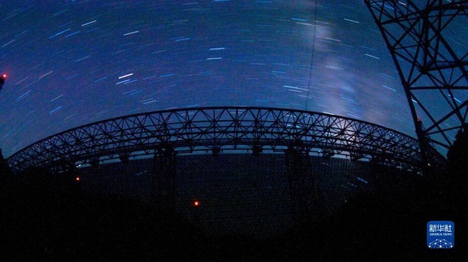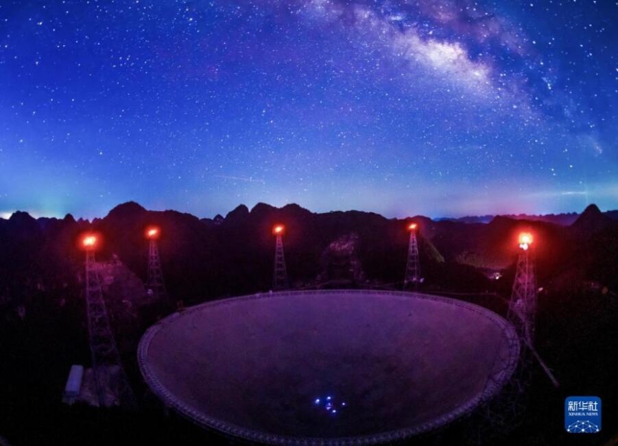 7月25日,星空下的“中国天眼”(维护保养期间拍摄,长时间曝光照片)。截至目前,被誉为“中国天眼”的500米口径球面射电望远镜已发现660余颗新脉冲星。“中国天眼”已进入成果爆发期。新华社记者 欧东衢 摄