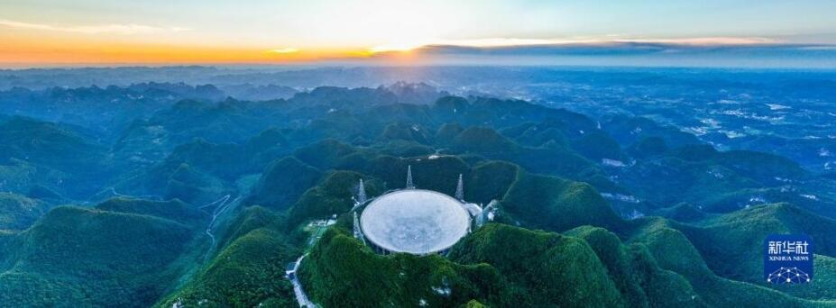 7月25日,晨曦中的“中国天眼”(维护保养期间拍摄,无人机照片)。截至目前,被誉为“中国天眼”的500米口径球面射电望远镜已发现660余颗新脉冲星。“中国天眼”已进入成果爆发期。新华社记者 欧东衢 摄