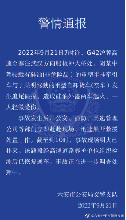 安徽一高速路段,一辆货车(运输硅油)追尾另一辆货车(空车)后着火,据@六安公安交警微发布通报:9月21日7时许,G42沪蓉高速金寨往武汉方向船板冲大桥处,胡某中驾驶载有硅油(非危险品)的重型半挂牵引车与丁某明驾驶的重型自卸货车(空车)发生追尾碰撞,造成硅油外溢两车起火,一人轻微受伤。截至10时,事故现场明火已扑灭。该路段经高速道路养护单位组织检测后已恢复通车。事故正在进一步调查处理中。