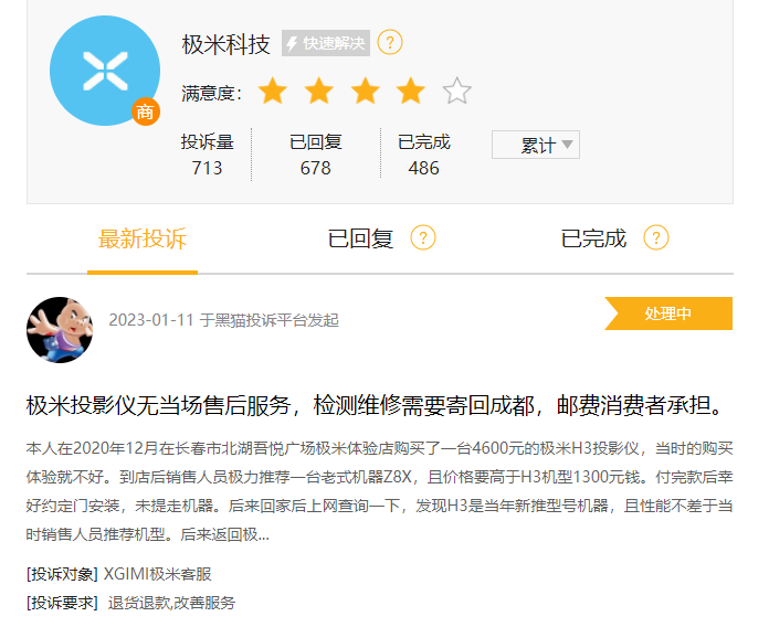 1月11日,在黑猫投诉平台,极米科技投诉量又有新增。网站截图 华龙网发