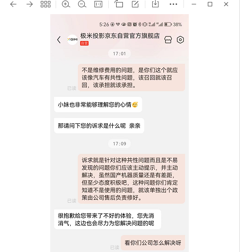 张晓军认为,极米售后工作人员“走流程式”的重复沟通,是在浪费时间。电话既没有询问他的诉求,也没有对产品出现问题给出合理的解释,并称1000元的维修价是经过“特殊申请的”。“他们模板式的回复中,透露出冰冷的傲慢!”