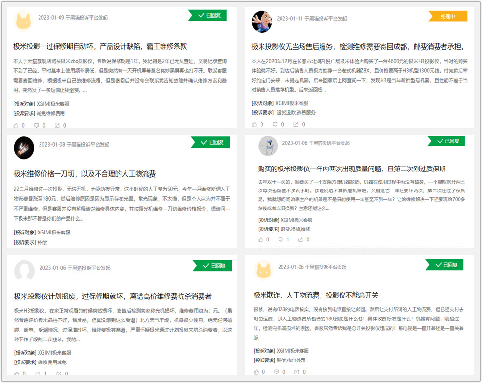 就在1月8日,还有消费者在该平台投诉:“极米维修价格一刀切,以及不合理的人工物流费。”1月9日,有消费者投诉:“极米投影一过保修期自动坏,产品设计缺陷,霸王维修条款”……诸多投诉内容和张晓军的遭遇如出一辙。