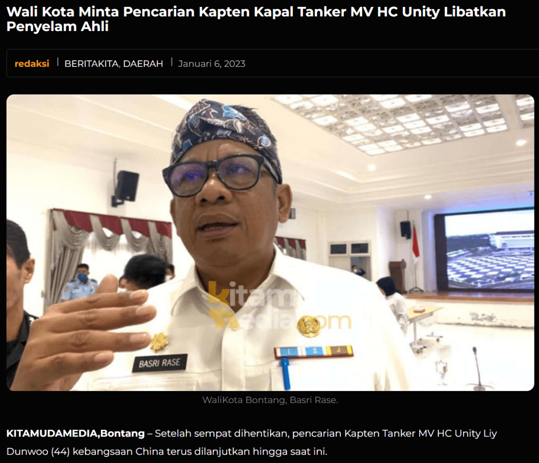 船员们在发现船长不见踪影后进行了两次搜寻,印尼警方和搜救团队多次在船上以及相近海域进行深潜搜索,但截至2023年1月15日尚未发现有效线索。