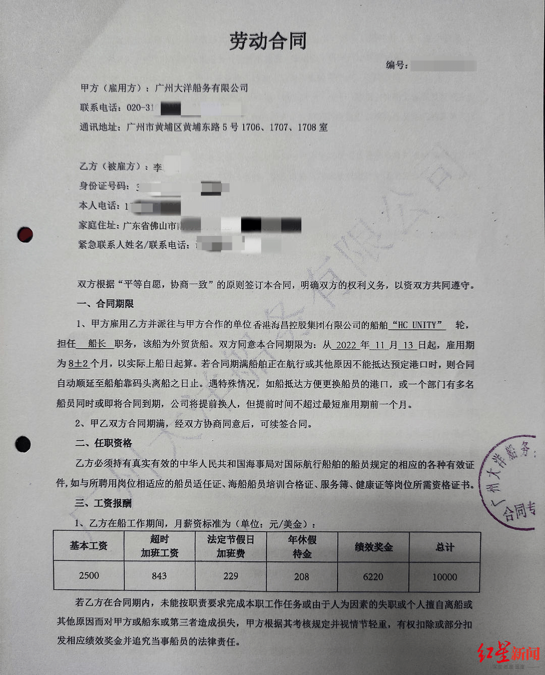 劳动合同显示,甲方广州大洋船务有限公司雇佣乙方李磊,并派往与甲方合作的单位香港海昌公司的船舶“HC UNITY”轮,任船长职务,该船为外贸货船。双方同意本合同期限为2022年11月13日起,雇用期为8±2个月,以实际上船日起算。