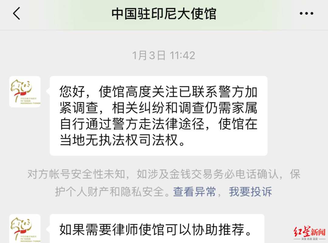家属提供的聊天记录截图显示,1月3日,中国驻印尼大使馆向潘女士表示,使馆高度关注并已联系警方加紧调查,相关纠纷和调查仍需家属自行通过警方走法律途径,使馆在当地无执法权司法权。