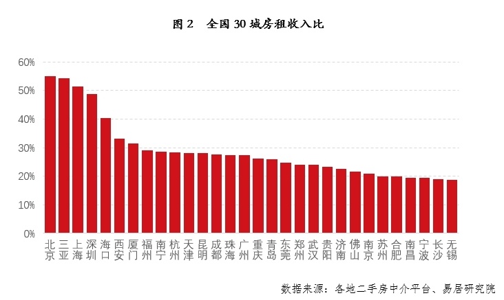 报告显示,从房租收入比来看,2023年5月,全国30个重点城市房租收入比为29%,这意味着租客需要掏出近3成的工资等收入用于租房。从排序来看,房租收入比排名前5的城市分别为北京、三亚、上海、深圳和海口,其房租收入比分别为55%、54%、51%、49%和40%。
