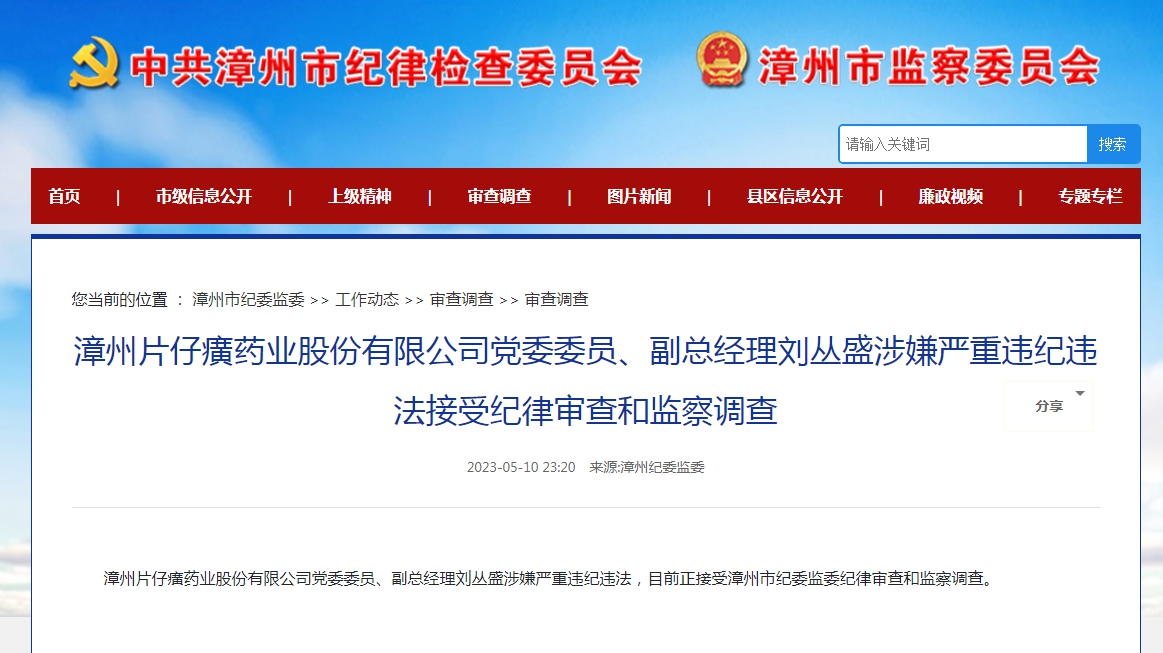 漳州市纪委监委通报,漳州片仔癀药业股份有限公司党委委员、副总经理刘丛盛涉嫌严重违纪违法,目前正接受漳州市纪委监委纪律审查和监察调查。