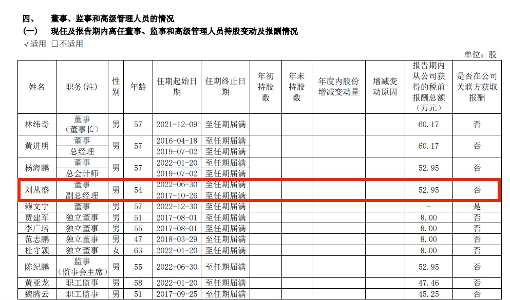 据片仔癀2022年年报,刘丛盛,男,1969年10月出生,中共党员,大学本科,理学学士,高级经济师、副主任药师、执业药师。1991年8月至1995年7月,历任漳州片仔癀集团公司(漳州市制药厂)第一车间科员、药物研究所科员、供销科科员;1995年7月至1999年12月,任漳州片仔癀集团公司(漳州市制药厂)供销科副科长;1999年12月至2017年10月,历任公司供销科副科长、经营部主任助理、经营部副主任、国内市场部主任、市场策划部主任、产品销售部主任、营销中心副主任、总经理助理;2017年10月至2020年10月,任公司副总经理兼营销中心主任、国际贸易部主任;2020年10月至2022年1月,任公司副总经理兼质量负责人;2022年1月至2022年8约,任公司董事、副总经理兼质量负责人,2022年8月至今,任公司董事、副总经理兼研究院院长兼质量负责人。其2022年从公司获得的税前报酬总额为52.95万元。