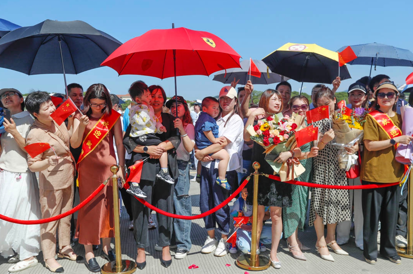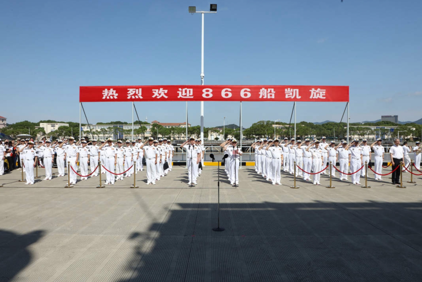 东部战区海军领导及任务官兵家属代表在码头迎接。