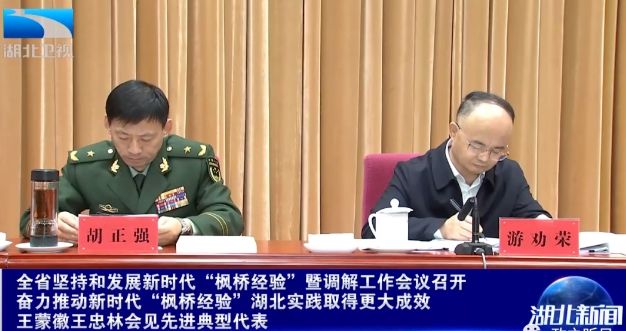 湖北新闻联播画面中,胡正强身着戎装出席上述会议,其肩章显示,胡正强为少将。