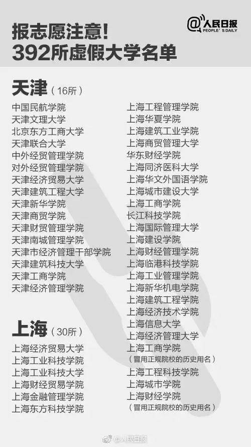 去年,人民日报曾总结了历年来出现过的“野鸡大学”名单,全国近400所。这份名单是近年来曾经“露头”的“野鸡大学”的集纳,多数已经销声匿迹,在“百度百科”等搜索引擎上被明确标注为“野鸡大学”。这里再次公布出来,意在提醒广大考生和家长时刻警惕,以防它们改头换面,通过线下招生或者电话、短信等方式继续诈骗。