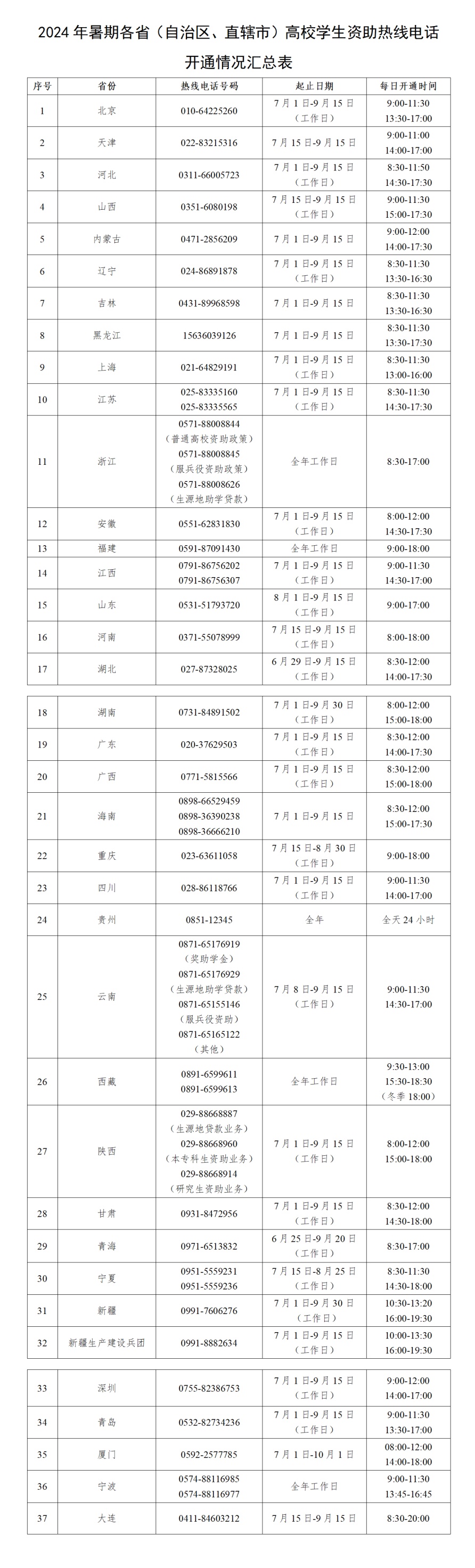 今年暑期,教育部将继续开通高校学生资助热线电话,号码为010—66097980、010—66096590,受理时间为7月1日—9月15日,每天8:00—20:00,为大学新生特别是家庭经济困难的大学新生提供资助政策咨询与帮助。各省(自治区、直辖市)和中央部门所属高校同步开通热线电话,电话号码与开通时间跟教育小微一起来看 ↓↓↓