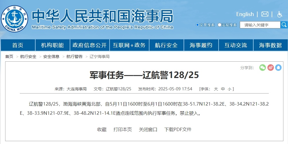 航行警告!渤海海峡黄海北部执行军事任务