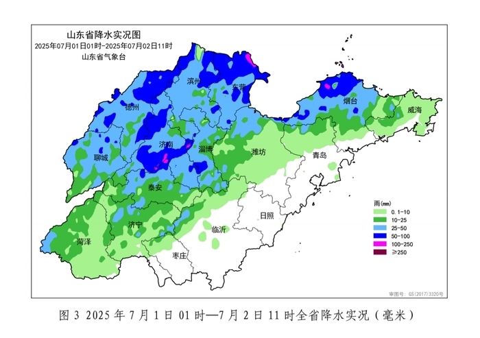 从过程降雨量来看,7月1日1时至2日11时,全省共有15市、106县(区市)、1604乡镇测站出现降水,平均降水量21.4,折合水量约33.6亿立方米。降水量前3位的是:烟台龙口市龙口芦头181.2、烟台蓬莱区大黑山岛132.0、济南历城区历城西营枣林130.2。