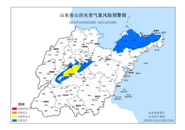青岛日报社/观海新闻10月9日讯 山东省水利厅和山东省气象局10月9日联合发布山东省山洪灾害气象预警:预计10月9日20时至10月10日20时,济南、淄博、泰安等市局部地区发生山洪灾害的可能性较大(黄色预警),济南、青岛、淄博、烟台、潍坊、泰安、威海等市局部地区可能发生山洪灾害(蓝色预警)。