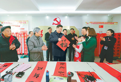 2016年2月1日至3日,习近平来到江西,看望慰问广大干部群众和驻赣部队。这是2月3日,习近平在南昌市东湖区彭家桥街道光明社区书画室,接过一位小朋友现场书写的“福”字,祝大家都幸福。新华社记者 兰红光 摄