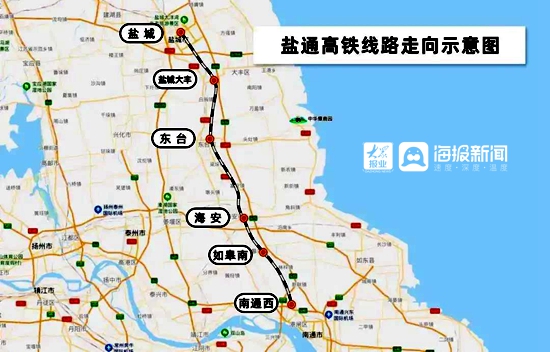 盐通高铁位于江苏省东部沿海,北起盐城市,向南经大丰区、东台市、海安市、如皋市,终至南通市,线路全长158公里,设计时速350公里,共设盐城、盐城大丰、东台、海安、如皋南、南通西6座车站。