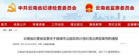 6月4日深夜,云南省纪委监委网站发布了《云南省纪委省监委关于曲靖市沾益区统计违纪违法典型案例的通报》:云南省纪委省监委对省统计局移送的曲靖市沾益区统计违纪违法相关问题线索,进行了认真调查核实。