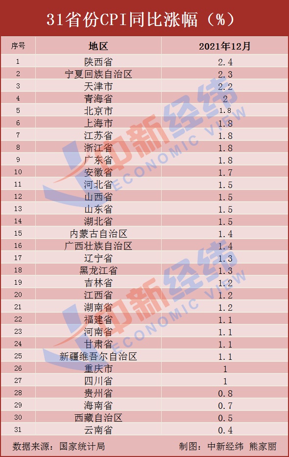 中新经纬1月15日电 (熊家丽)近日,国家统计局公布31省份2021年12月份居民消费价格指数(CPI)。数据显示,17省份12月CPI同比涨幅低于全国,其中,云南涨幅最低为0.4%。