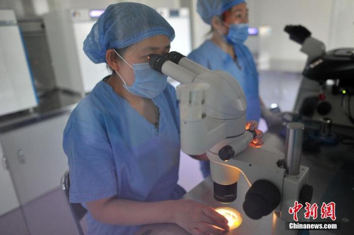 资料图:图为医生将精子滴入装有卵子的培养皿中后用显微镜监测。韦亮 摄