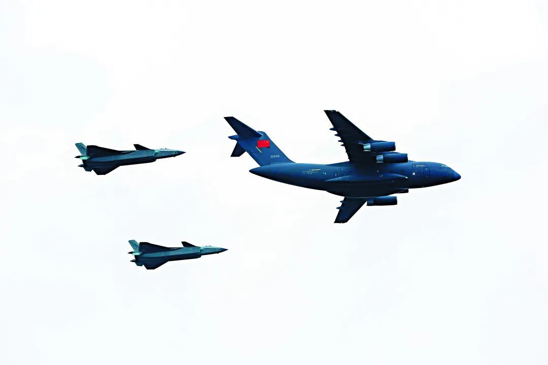 两架歼-20战机为运送烈士棺椁的运-20专机伴飞护航。大公报记者 于珈琳 摄