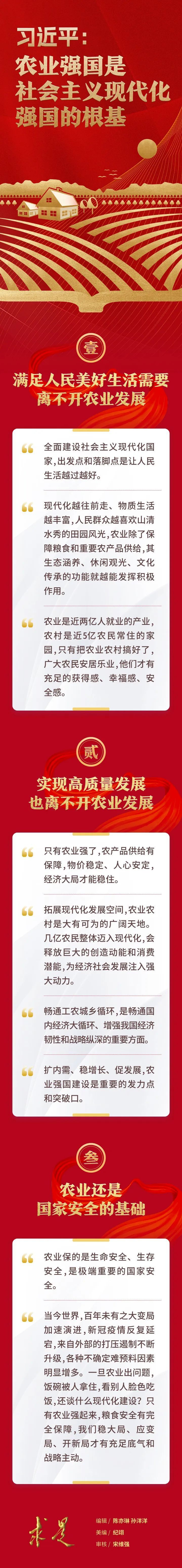强国必先强农,农强方能国强。3月5日,习近平总书记在参加十四届全国人大一次会议江苏代表团审议时强调,农业强国是社会主义现代化强国的根基,推进农业现代化是实现高质量发展的必然要求。