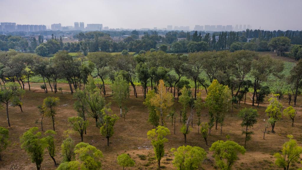 2020年9月27日拍摄的陕西省靖边县城旁的西草滩湿地公园(无人机照片)。新华社记者 陶明 摄