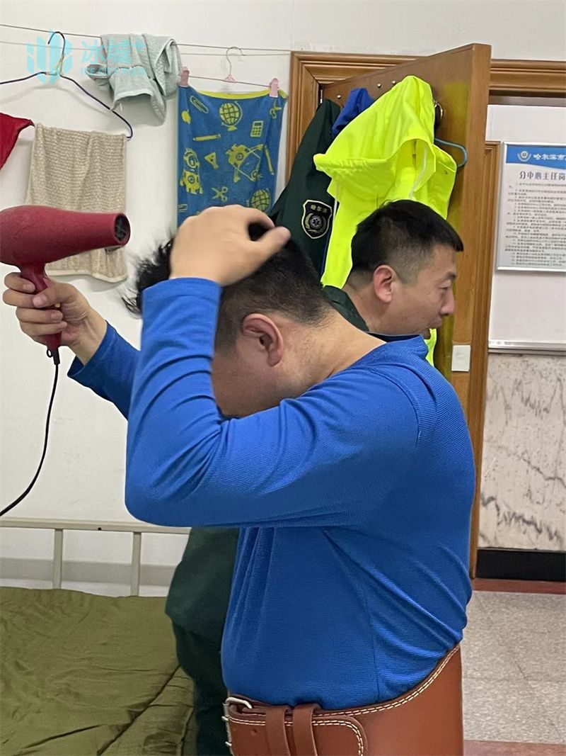 12时26分,车组再次回到了急救分中心,此时饭已经摆在桌上一个半小时了。四名急救人员开始快速吃午饭,第一个吃饭的是医生李奕霖,仅用了六分钟,最后一个吃完的是司机李赋翼,用了九分钟。吃完饭之后站内仅有的一个吹风机就成了抢手货,用它吹早就被雪淋湿了的头发,头发湿会感冒,用它吹早就湿透了的鞋子,鞋底太冷跑不快,车开得不快,下车以后就要跑得更快,这样才能抢回时间,毕竟每一分钟都是患者的生命健康,实在耽误不得。