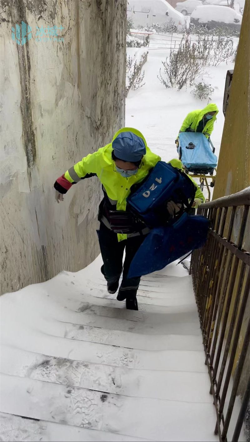 没有一点犹豫,车组四个人立即回到岗位,急救车再次前往道外区。该小区有一段室外楼梯,雪已经堆在楼梯上了,引路的家属就摔了一下,担架员闫兆坤也在上楼的时候就滑了一跤。“还好担架没摔坏”在同行人问他是否摔伤时,他自语了一句。