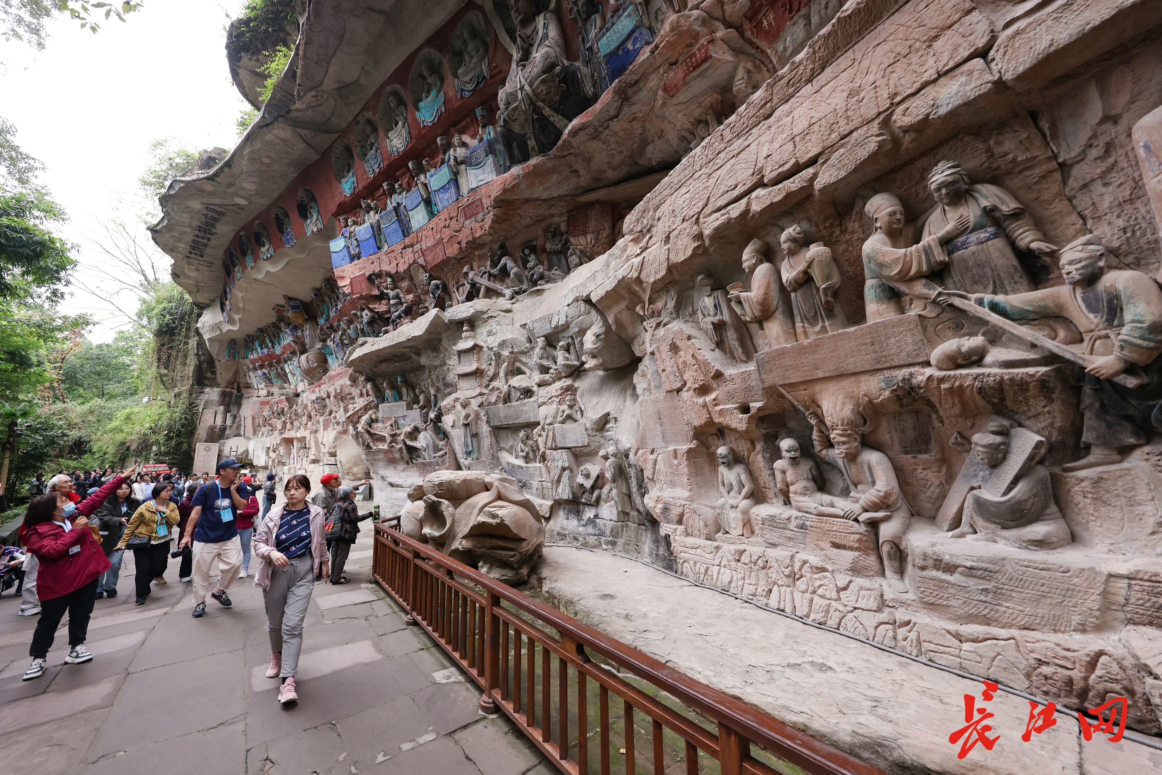 11月5日上午,“沿着长江读懂中国——万里长江行”探访团走进重庆大足石刻博物馆。这里是继敦煌莫高窟之后中国第二个石窟类世界文化遗产,被称为中国石窟艺术史上最后的丰碑。面对这5万尊穿越1200多年历史的石刻造像,探访团既为其非凡的艺术所震撼,也为世代守护这些宝贝、保存中华文脉的大足人所感动。