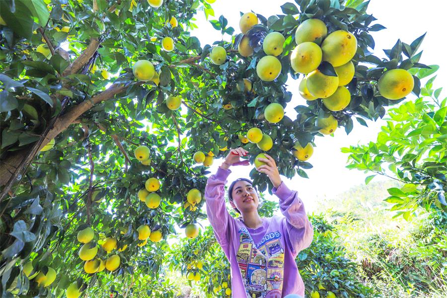 11月1日,大余县新城镇南丰村脐橙种植基地,村民在采摘赣南脐橙。当日,赣南脐橙统一开摘上市,各地果园一派繁忙景象。特约记者叶功富摄