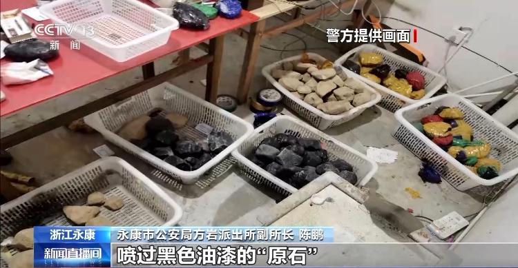 永康市公安局方岩派出所副所长陈鹏:经过我们前期一段时间的侦查,锁定了嫌疑人位于云南瑞丽的窝点。实施抓捕进入嫌疑人的窝点后,我们发现嫌疑人开设了多个直播间,同时我们发现嫌疑人用于直播的电脑、手机等物品,并且在房间内还发现了喷过黑色油漆的“原石”,经现场统计,该类“原石”的重量为1.1吨。