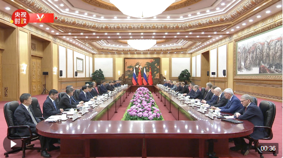 5月16日上午,国家主席习近平在北京人民大会堂同来华进行国事访问的俄罗斯总统普京举行大范围会谈。