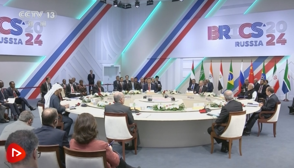 当地时间10月23日上午,金砖国家领导人第十六次会晤在喀山会展中心举行。俄罗斯总统普京主持会晤。中国国家主席习近平、巴西总统卢拉(线上)、埃及总统塞西、埃塞俄比亚总理阿比、印度总理莫迪、伊朗总统佩泽希齐扬、南非总统拉马福萨、阿联酋总统穆罕默德等出席。