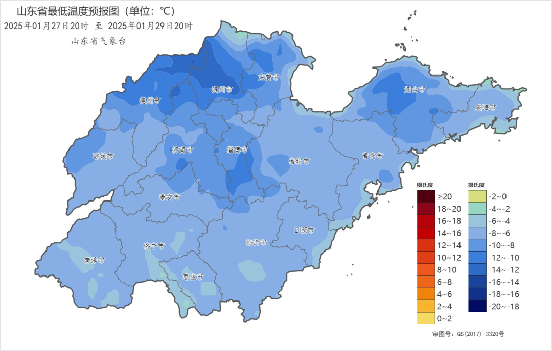 受寒潮影响,全省大部地区气温显著下降。预计26日夜间至30日,我省大部地区气温下降8—10℃,鲁西北、鲁中和半岛内陆地区最低气温在-11—-8℃,其他地区-7—-5℃。