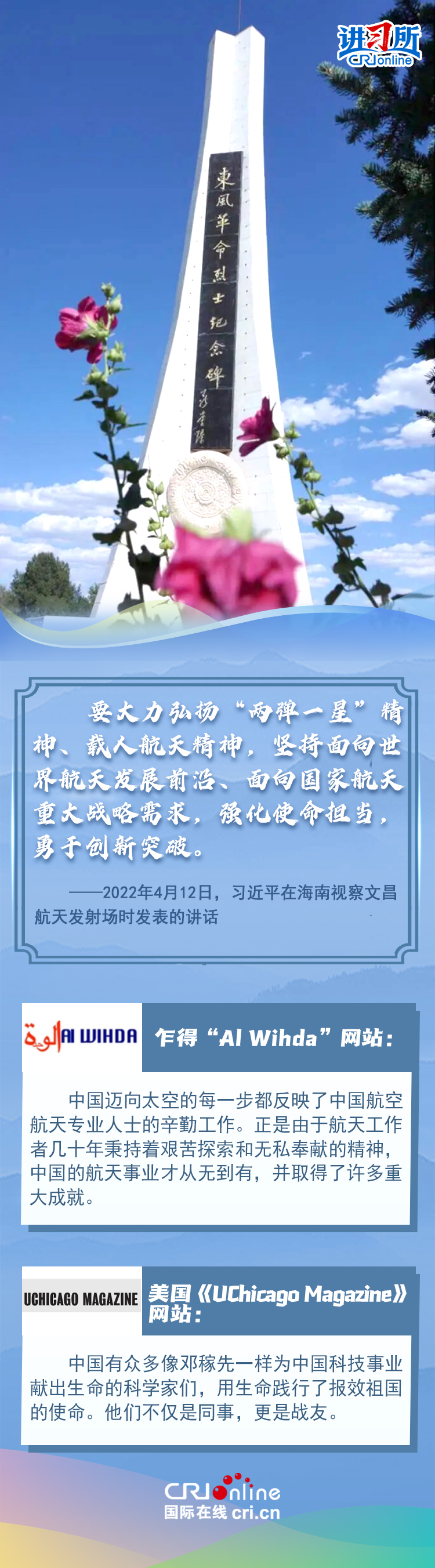新时代以来,从设立烈士纪念日到出台英雄烈士保护法,再到加强烈士纪念设施保护,中国崇尚英雄、学习英雄的社会风尚赢得国际社会赞誉。在国际人士眼中,中国多年来飞跃式的进步和发展,离不开人们对先辈意志的继承与实践。