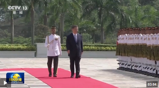 习近平乘车抵达时,易卜拉欣和马来西亚总理安瓦尔在下车处热情迎接。两国元首登上检阅台,军乐团奏中马两国国歌,鸣礼炮21响。习近平检阅仪仗队。两国元首进入国家王宫大厅,同双方陪同人员握手致意。