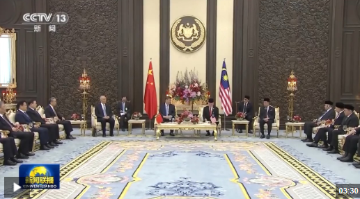 4月16日上午,马来西亚最高元首易卜拉欣在马来西亚国家王宫同中国国家主席习近平举行会见。