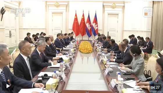 习近平指出,中柬两国是友好邻邦,更是铁杆朋友。构建中柬命运共同体是历史的选择、人民的选择。当前,中柬两国都处在国家发展的关键阶段,双方要心系人民福祉,胸怀人类进步,在推进各自现代化进程中,为构建人类命运共同体树立典范,携手做世界百年变局中的和平力量、稳定力量、进步力量。