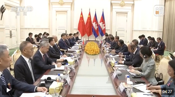 习近平指出,中柬两国是友好邻邦,更是铁杆朋友。构建中柬命运共同体是历史的选择、人民的选择。当前,中柬两国都处在国家发展的关键阶段,双方要心系人民福祉,胸怀人类进步,在推进各自现代化进程中,为构建人类命运共同体树立典范,携手做世界百年变局中的和平力量、稳定力量、进步力量。