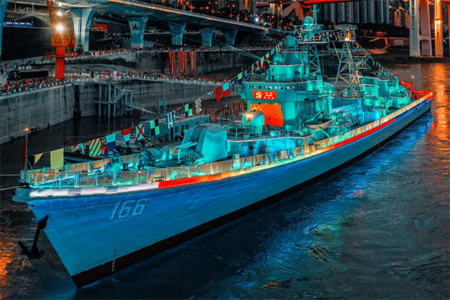 重庆建川海疆博览园由166舰陈列展、166舰光辉历程展、人民海军向前进——民间记忆展等展览构成,是西部地区有较高影响力的国防教育基地。2023年底,经国家文物局专家组评定,166导弹驱逐舰获评国家一级文物。如今,退役的166舰已肩负起新的使命。它作为国防教育的重要平台,让民众能够近距离接触和了解海军舰艇,感受人民海军的发展历程和强大实力。越来越多的学校、企事业单位组织人员前来参观学习,激发民众的爱国热情和国防意识。近年来,166舰也成为研学旅行的绝佳选择,每年会有近60万人的研学团队前来参观学习,共同感受人民海军战斗历程与海军建设成就,看到中国海军从弱到强、从近海走向远洋的壮丽史诗。