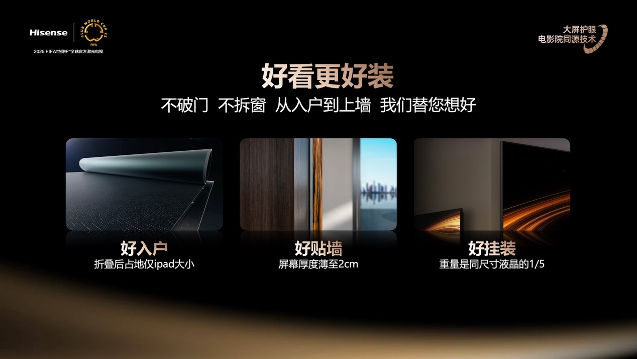 为解决家庭环境光干扰难题,海信历时五年研发出纳米光谱选择屏Pro。该屏幕历经1100余次实验、测试820块膜片,最终实现全屏稳定亮度1000nits(传统液晶电视仅为500nits),环境光遮蔽率高达87%。无论是白天的强光环境,还是夜晚的暗光场景,画面均能保持高亮通透。此外,探索X1 Ultra屏幕支持可折叠设计,120英寸巨幕折叠后包装仅1.7米,轻松入户。0贴墙安装与20KG超轻重量(仅为同尺寸液晶的1/5),完美适配各类家居风格。
