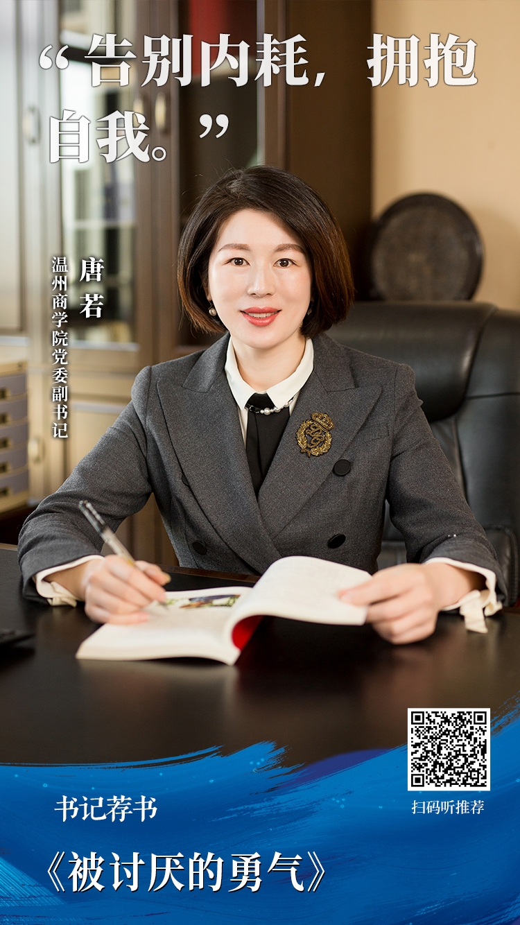 为充分发挥温州高校阅读联盟平台的纽带作用,营造高校师生人人参与、共建共享的良好阅读生态氛围,丰富高校师生精神文化生活,助力“书香社会、阅读温州”建设,即日起,温州高校阅读联盟正式启动“书香青春·领读未来”主题活动。活动期间,各在温高校书记、校长、图书馆馆长等将通过镜头推荐书籍,分享阅读感悟,启迪师生心智。5月25日,温州商学院党委副书记唐若带来《被讨厌的勇气》,一起学着“吾爱吾”。