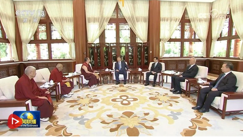 班禅向习近平敬献哈达,介绍了他近年来的学习工作情况。习近平对他在各方面取得的进步表示祝贺。